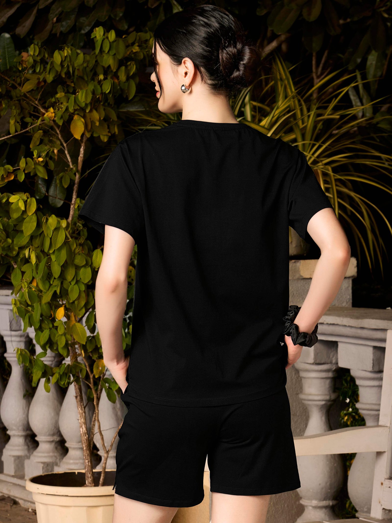 - Black Typography printed night suit consists of crop top and shorts