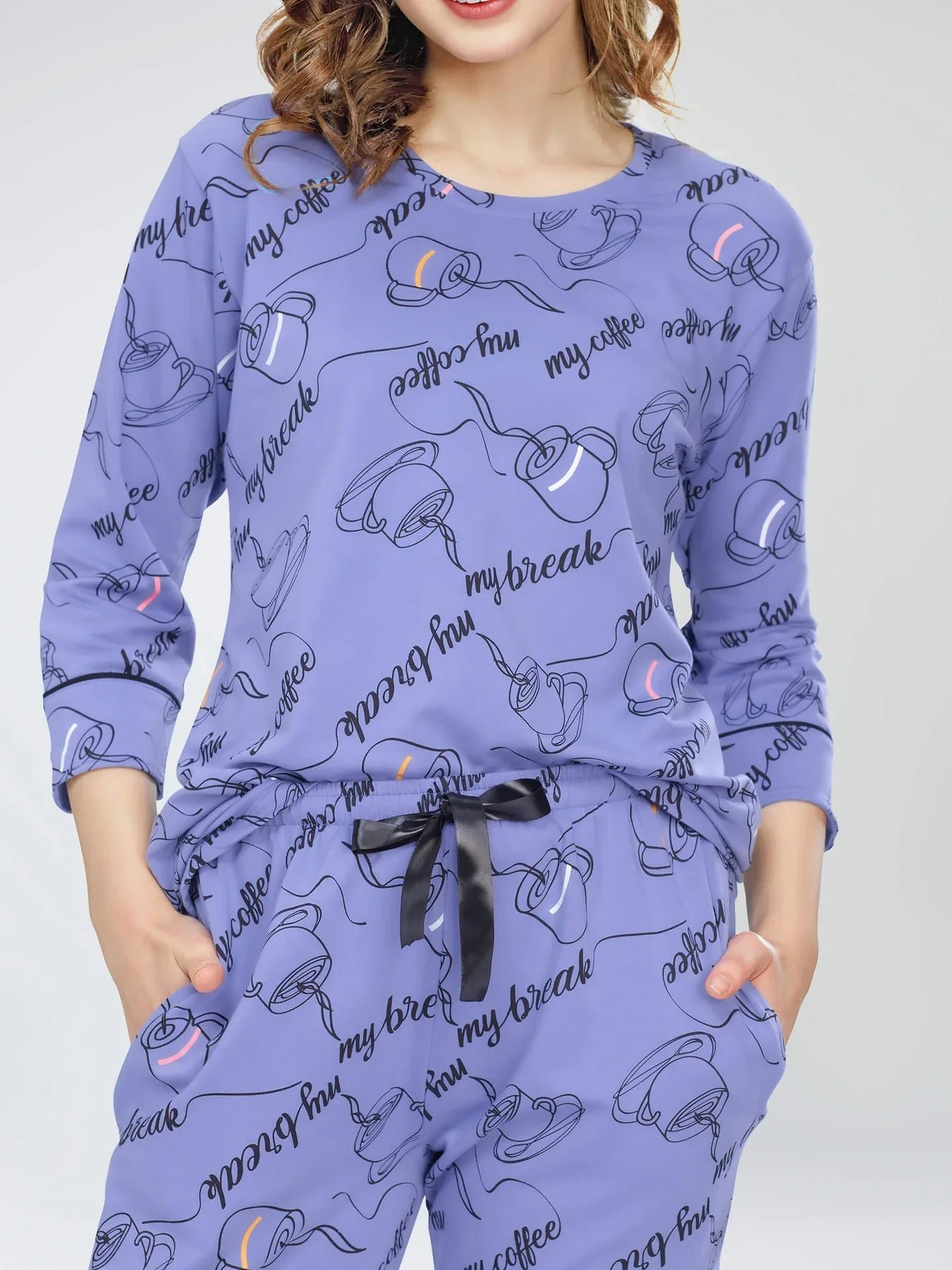 - Sea Blue Cup & Saucer Printed Cotton Night Dress of top and pyjamas