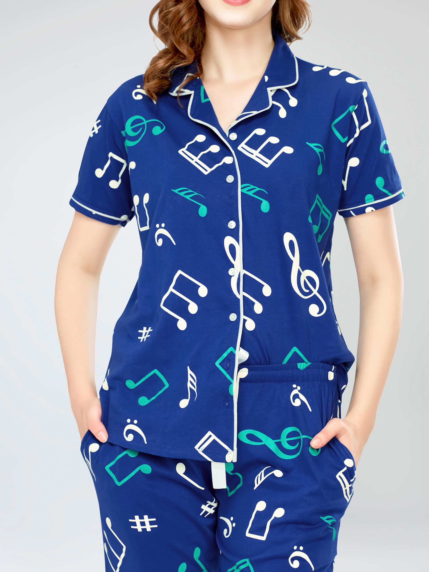- Blue Musical Note’s printed night suit consists of shirt and pyjamas