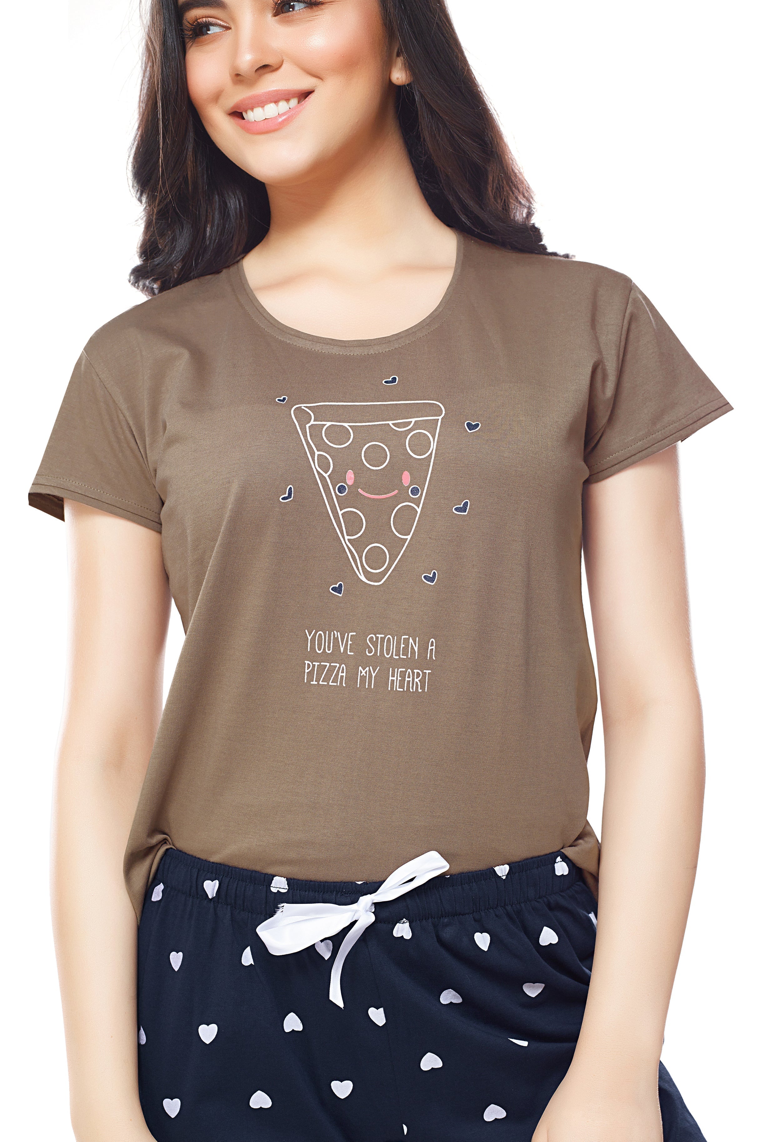 Women’s Cotton Brown Heart Printed Stylish Night Suit Set