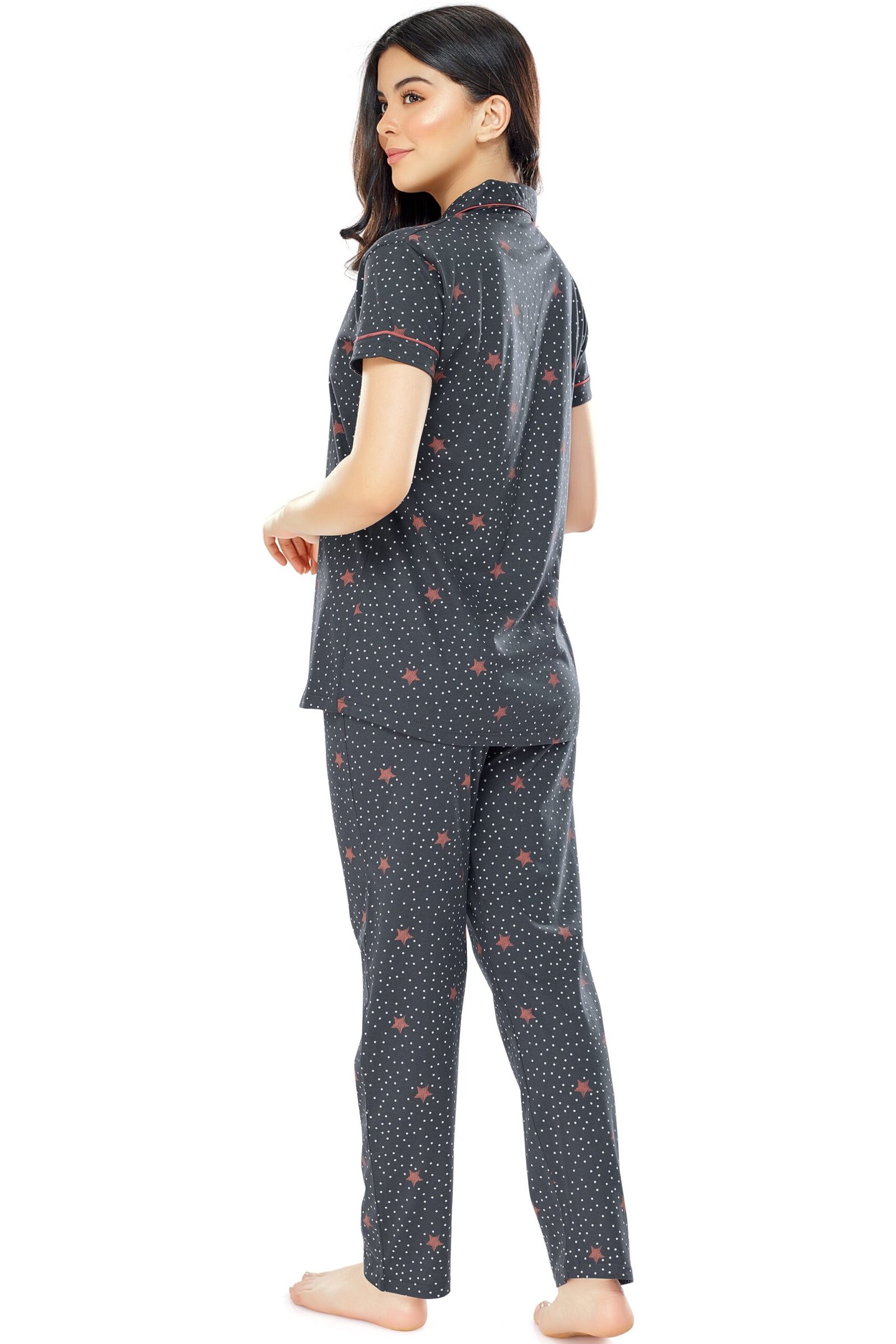 - Grey star and dot printed night suit consists of shirt and pyjamas