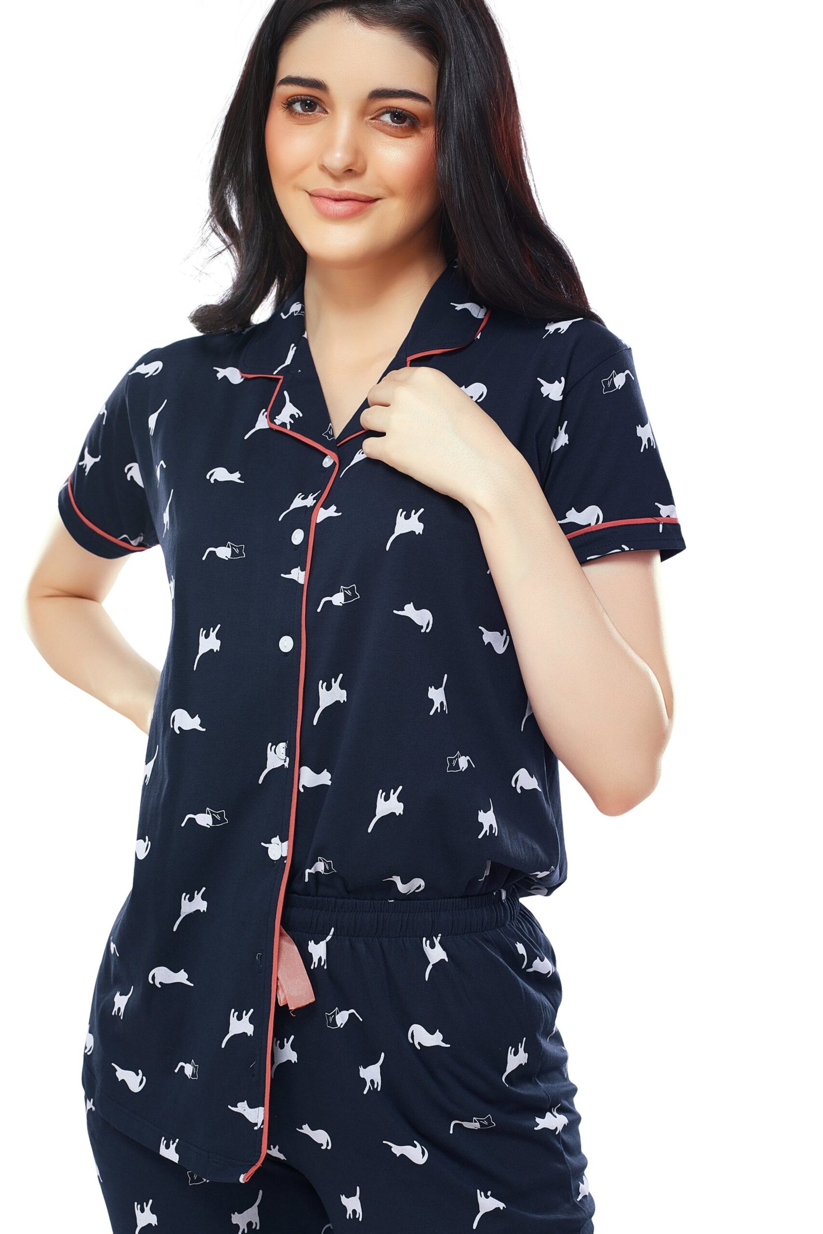 - Navy Blue, white cat printed shirt, has a notched collar, short sleeves