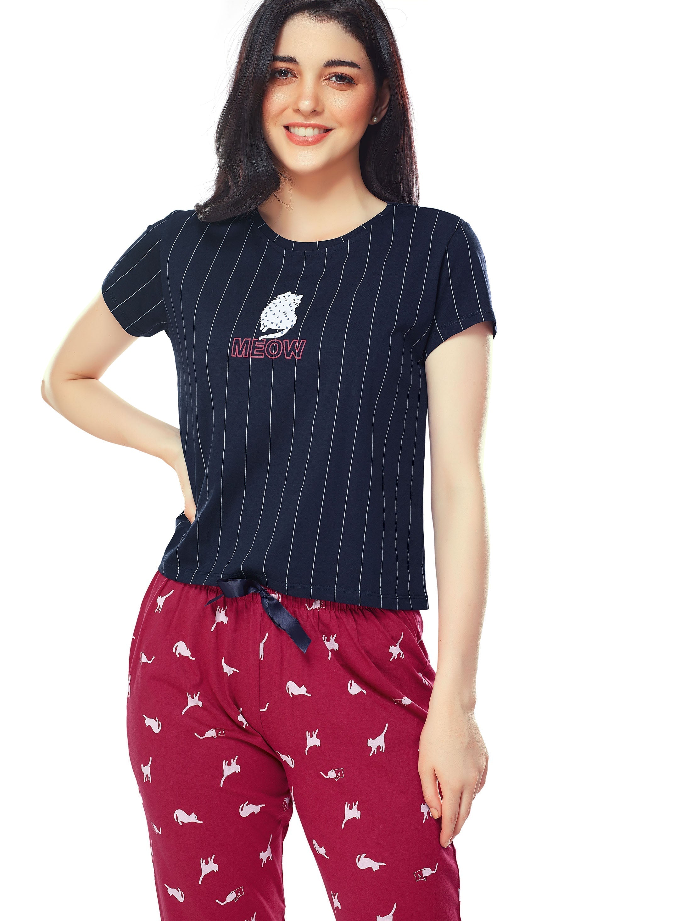 - Navy Blue and red night suit consists of crop top and pyjamas