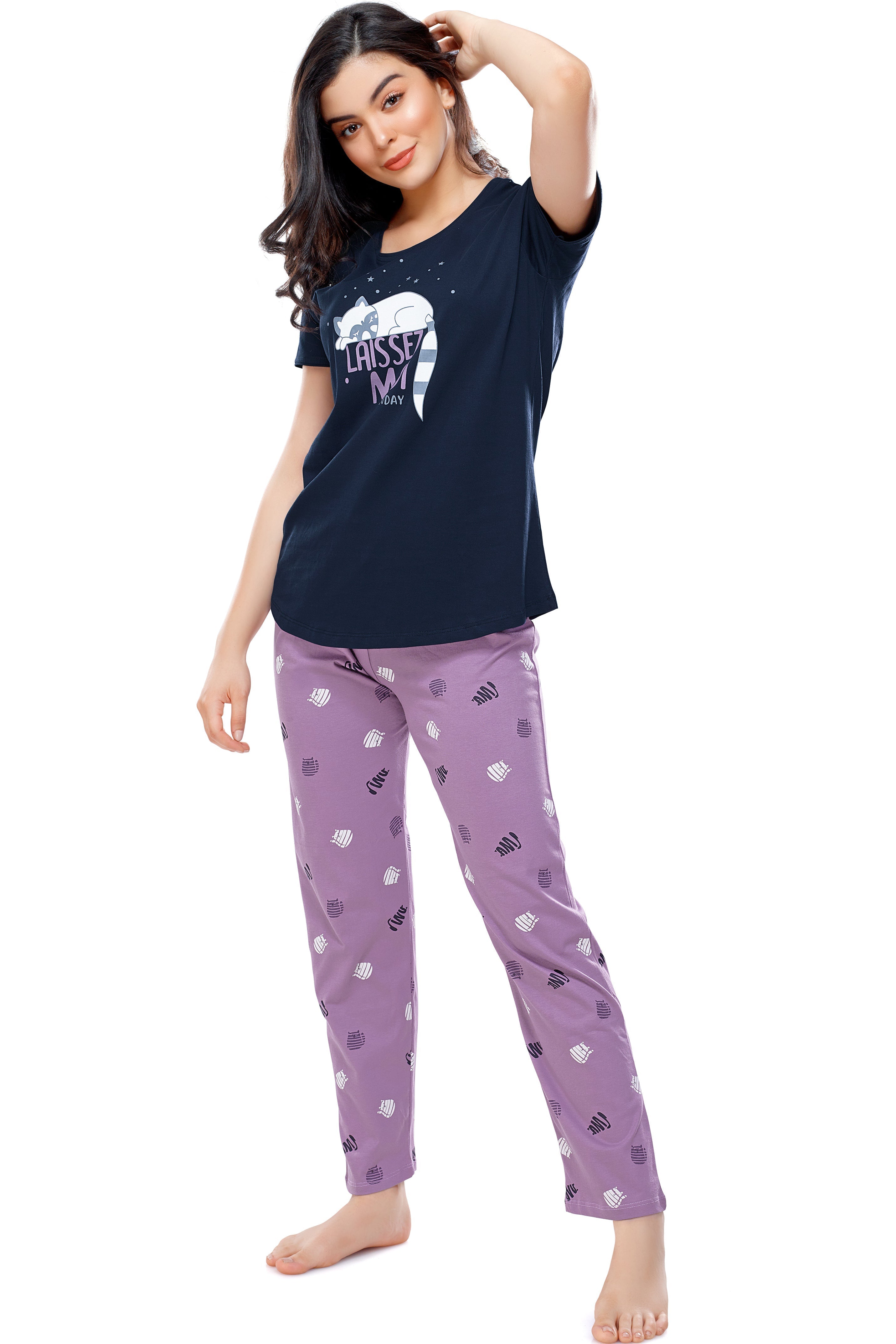 - A pair of purple cat printed pyjamas, has drawstring closure