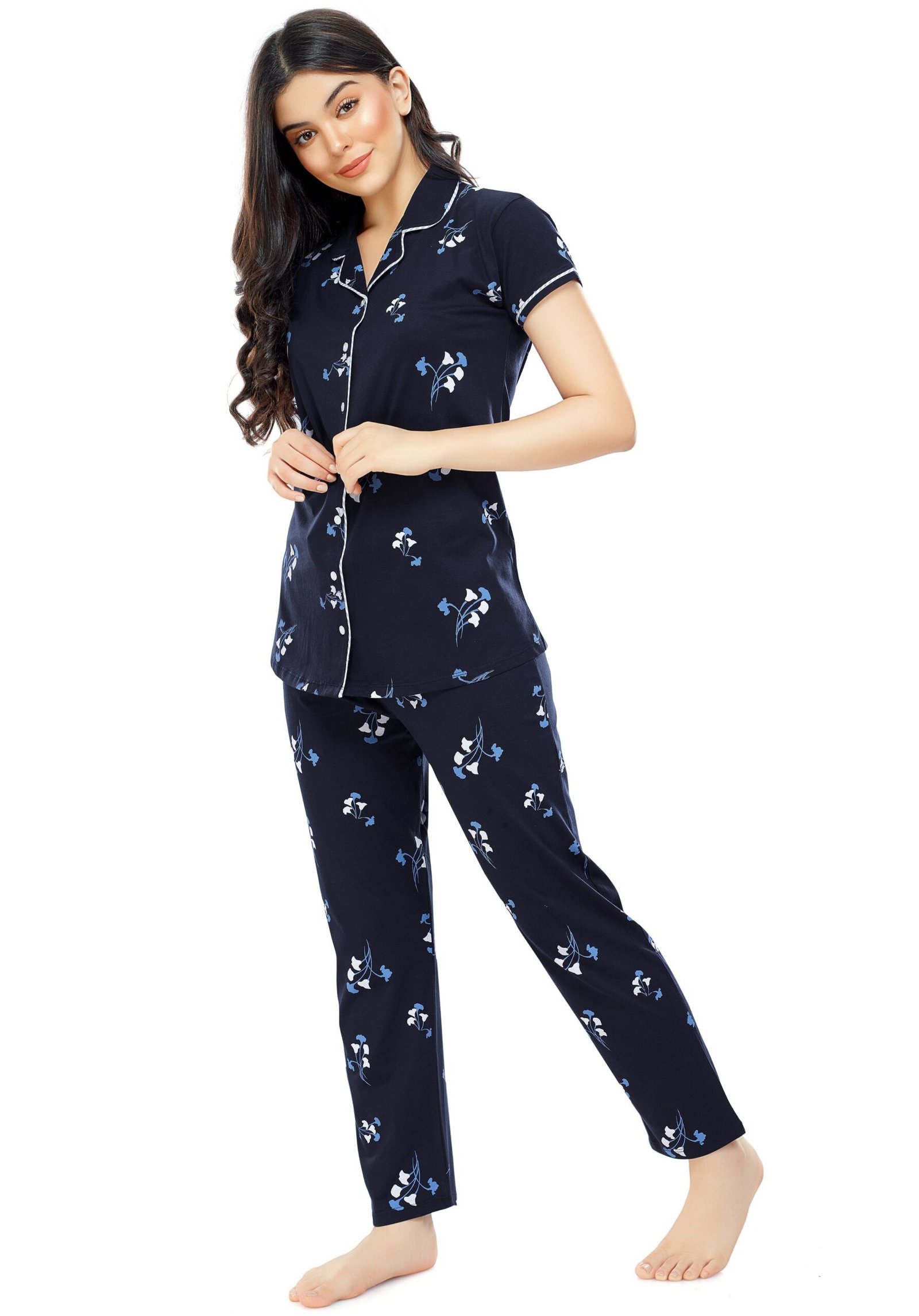 - Navy Blue floral printed shirt, has a notched collar, short sleeves