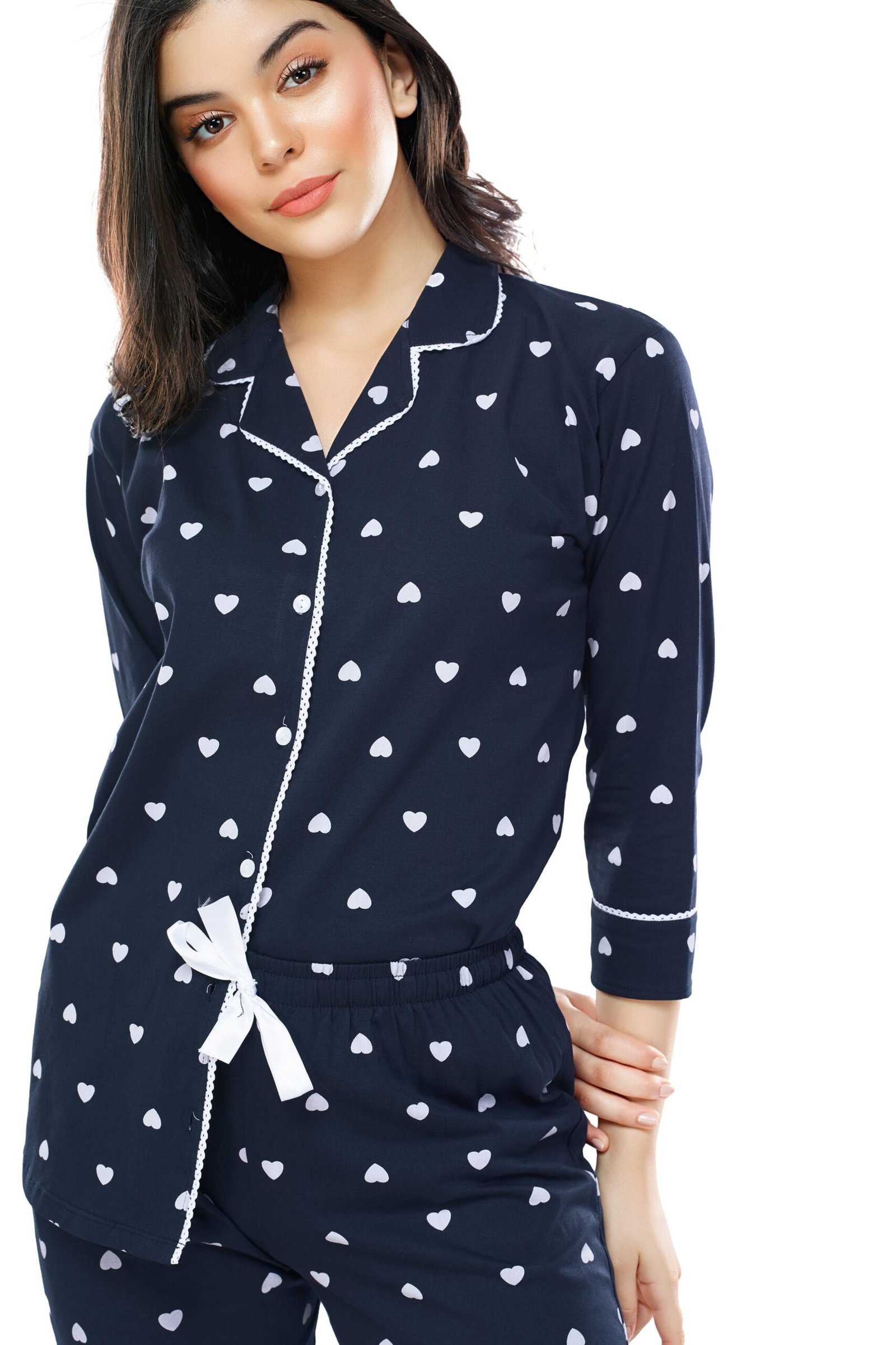 - Navy blue, white heart printed shirt, has a notched collar, three-quarter sleeves