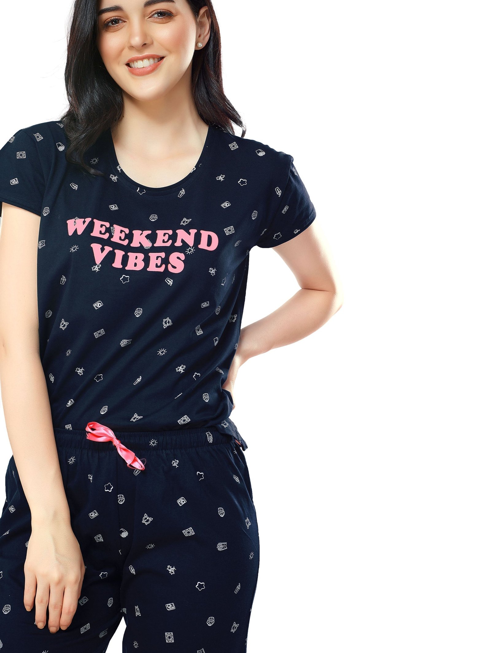 - Navy Blue multi printed night suit consists of top and pyjamas