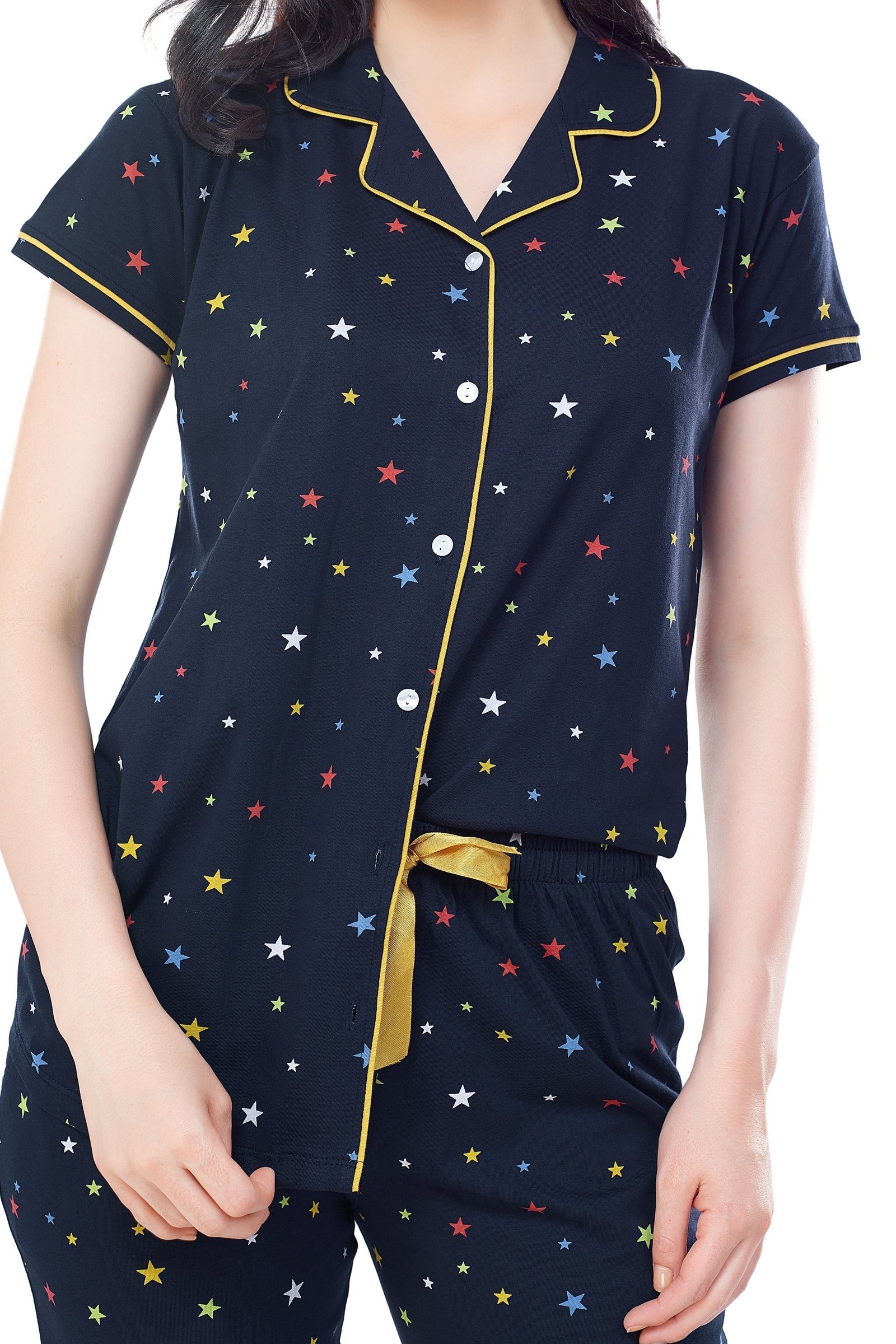 - Navy Blue stat printed night suit consists of shirt and pyjamas