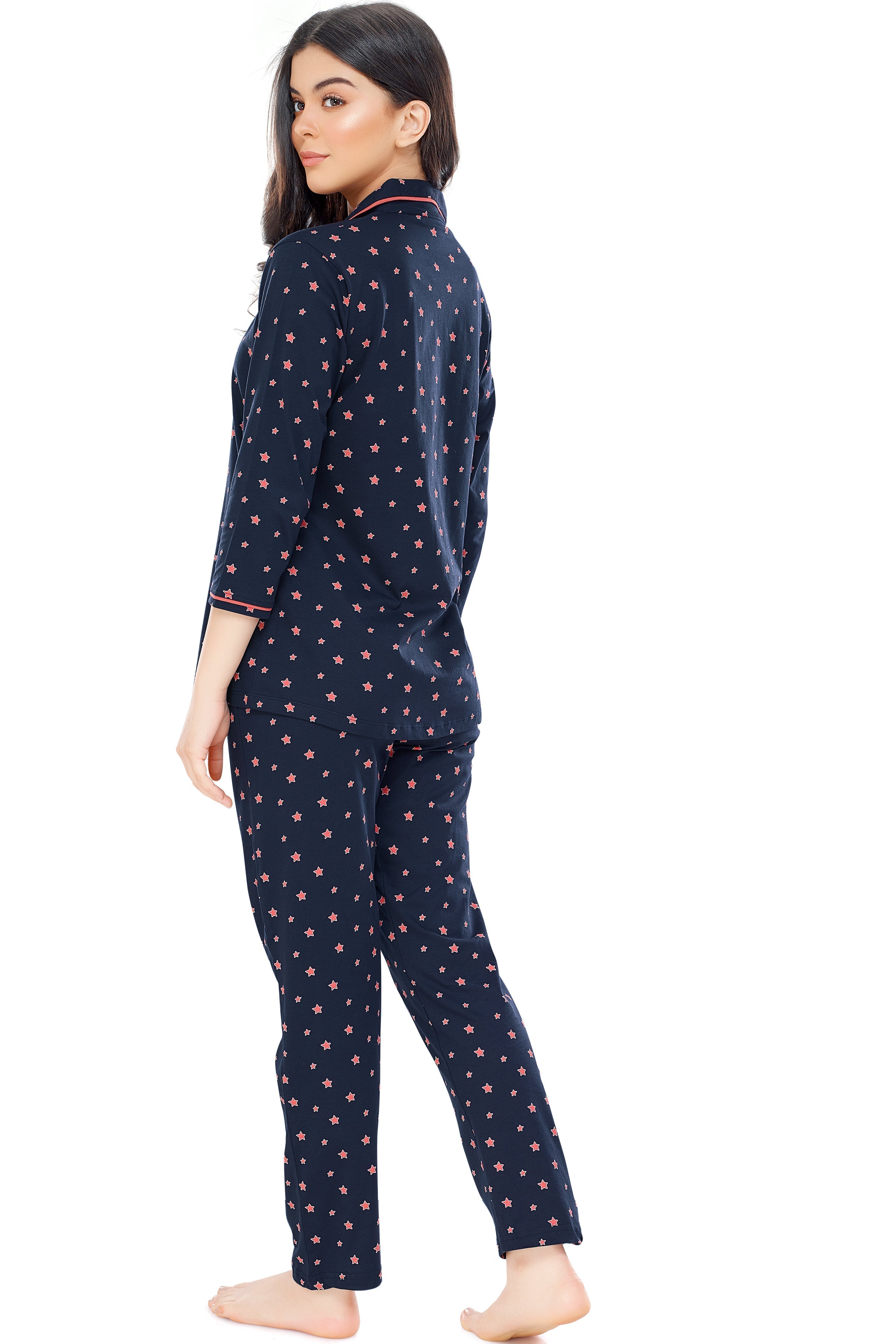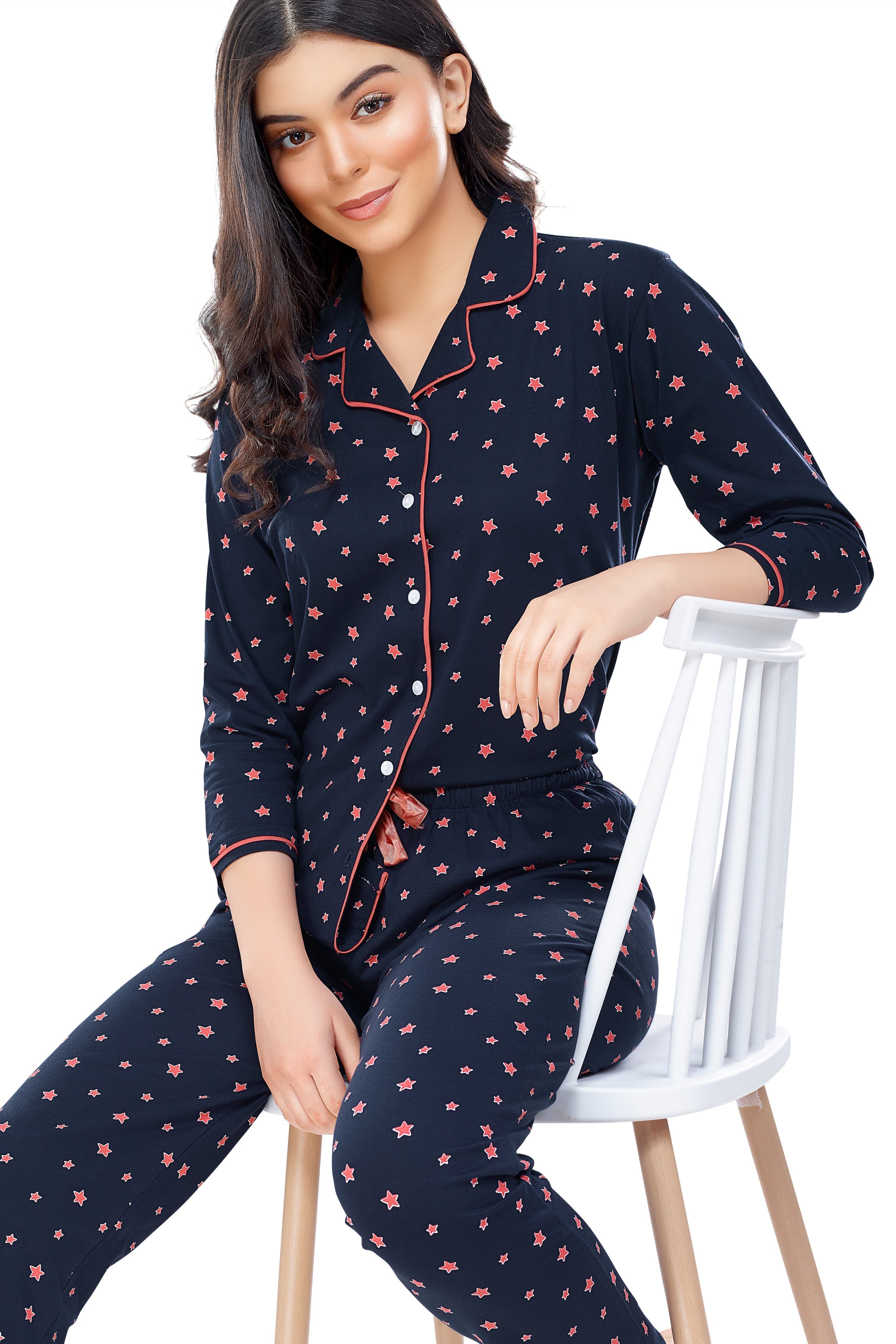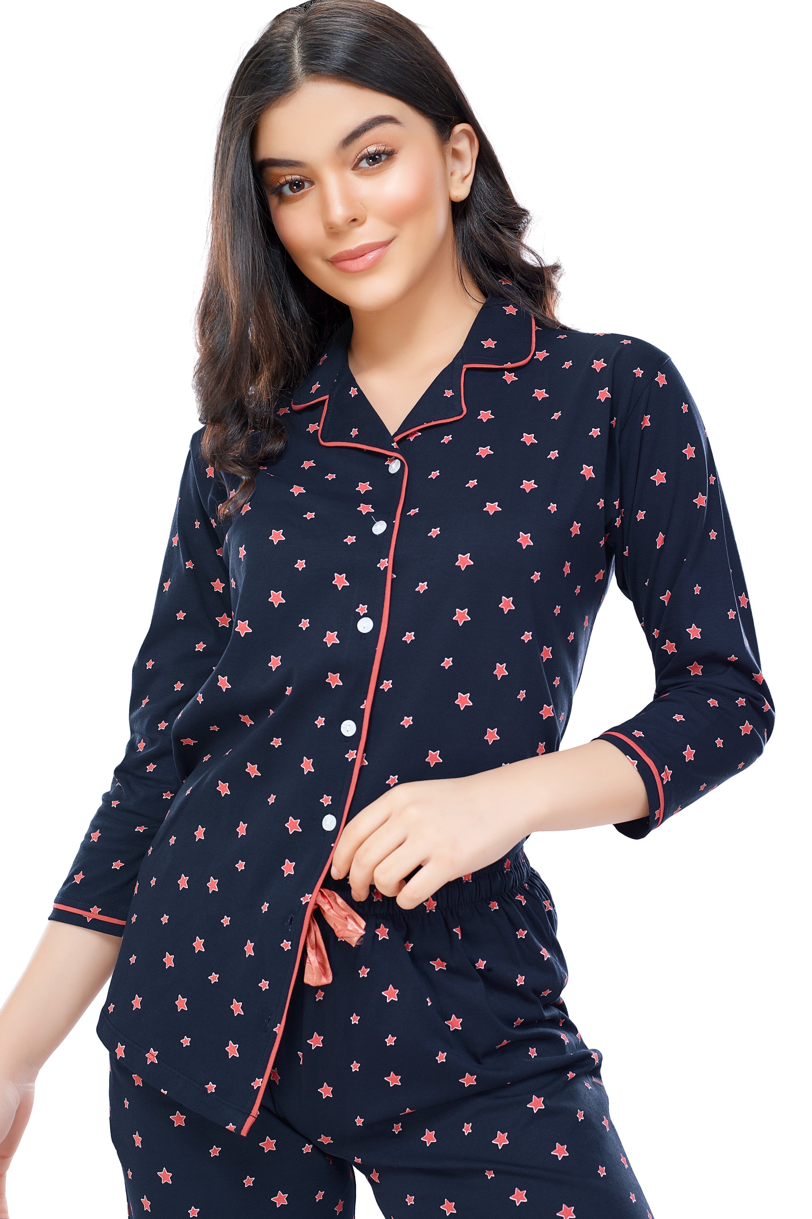 Women’s Cotton Navy Blue Star Printed Stylish Night Suit Set