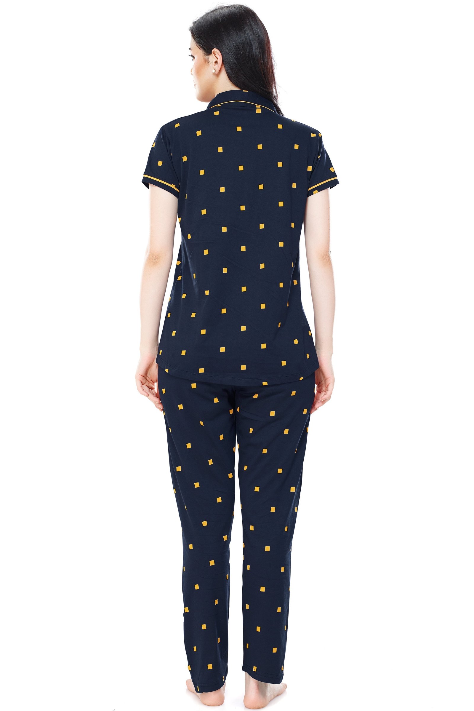 - Navy Blue, yellow square printed night suit consists of shirt and pyjamas