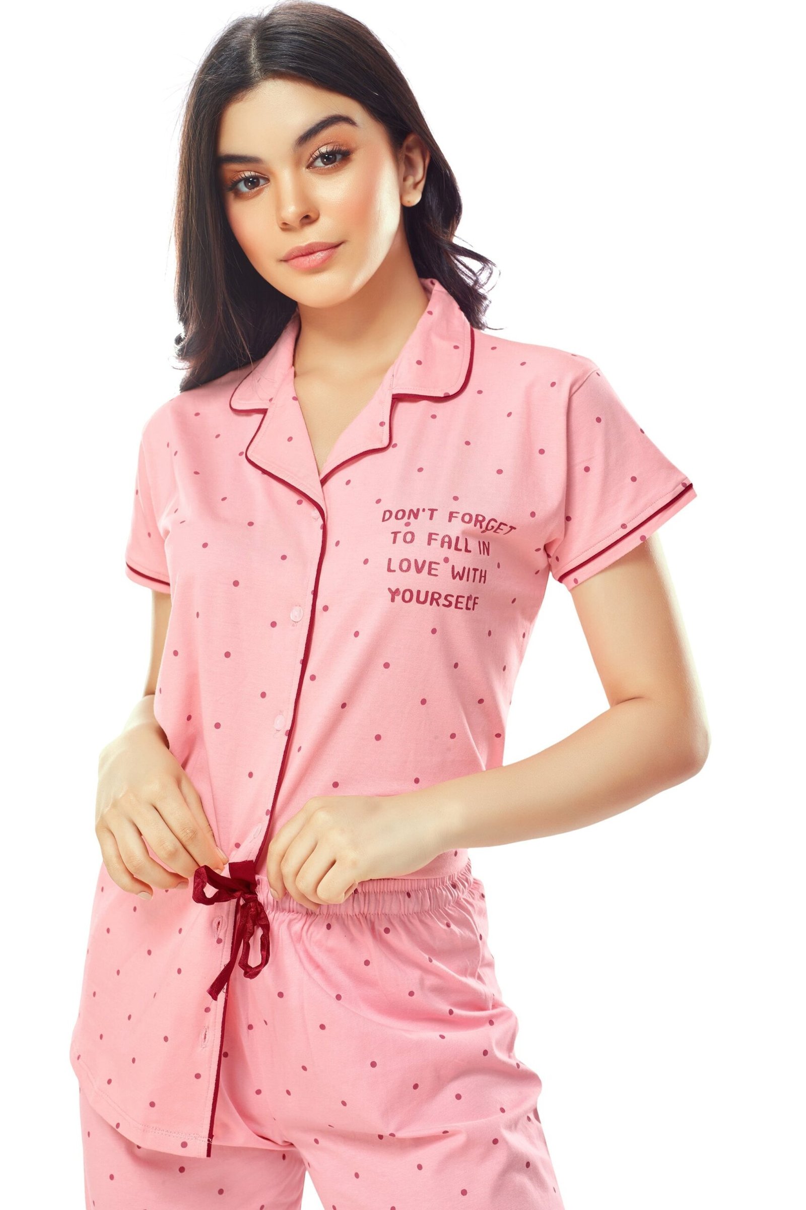 - Pink dot printed night suit consists of shirt and pyjamas