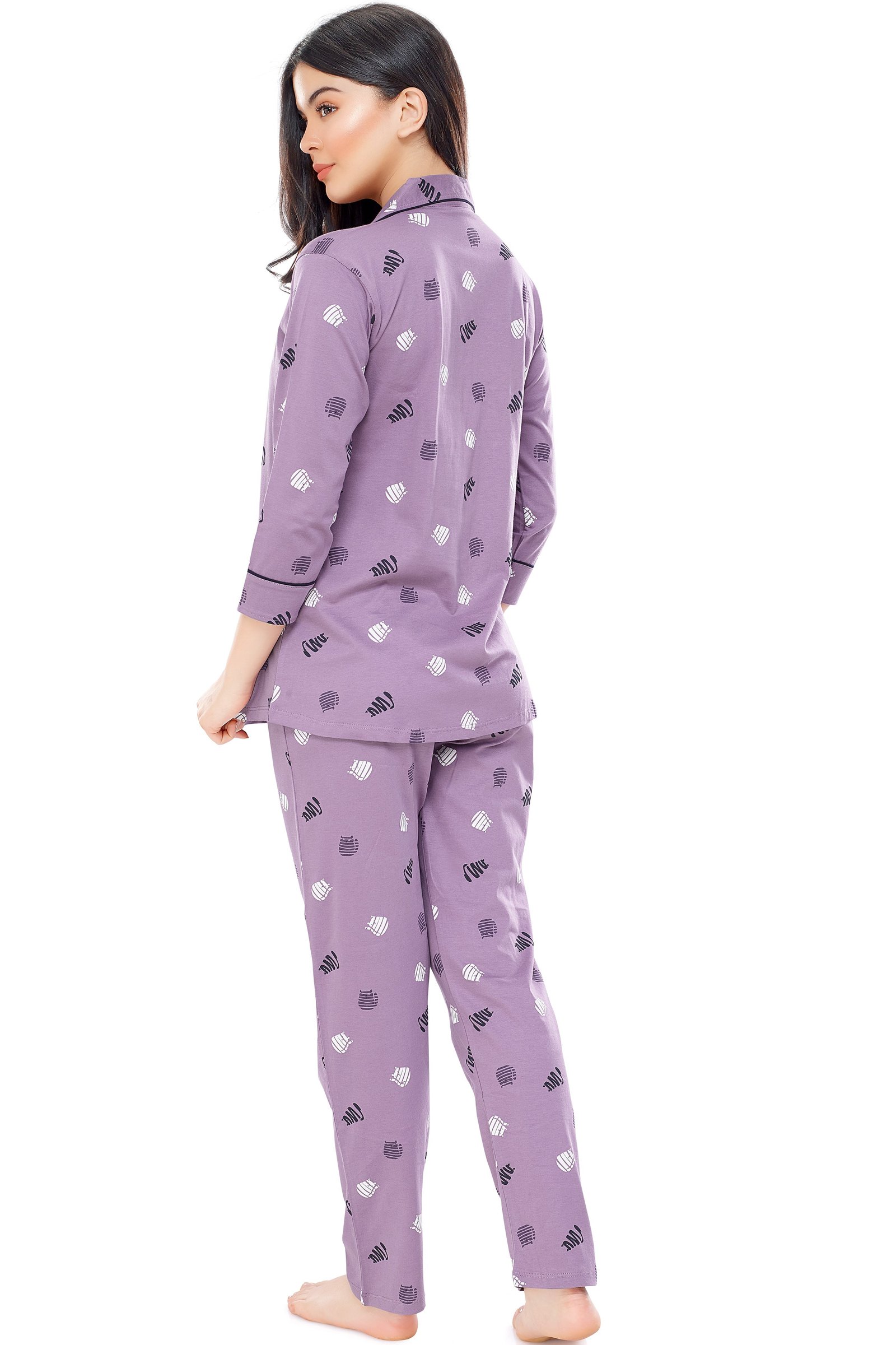 - Purple cat printed shirt, has a notched collar, three-quarter sleeves