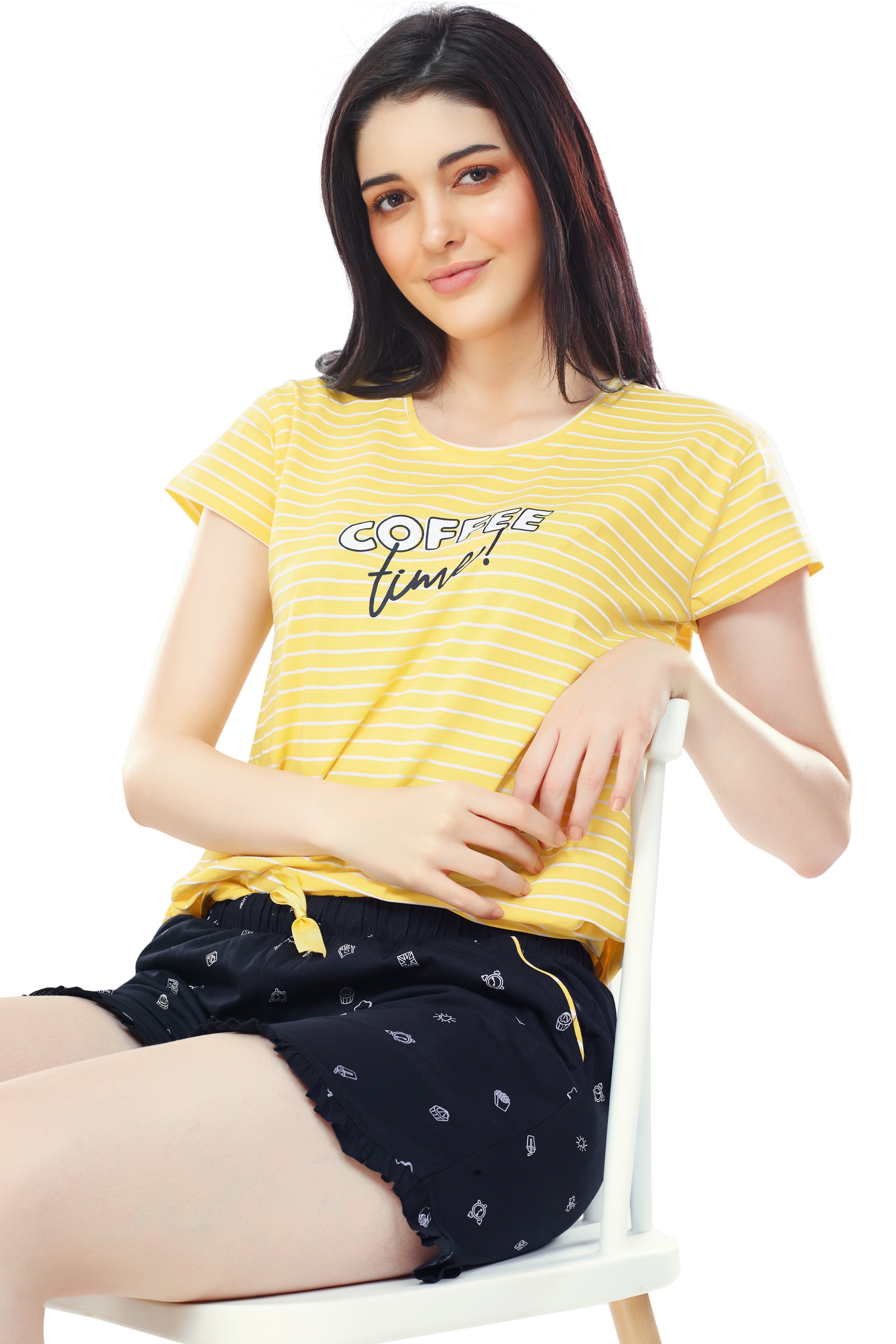 - Yellow and navy blue striped top, has a round collar, short sleeves