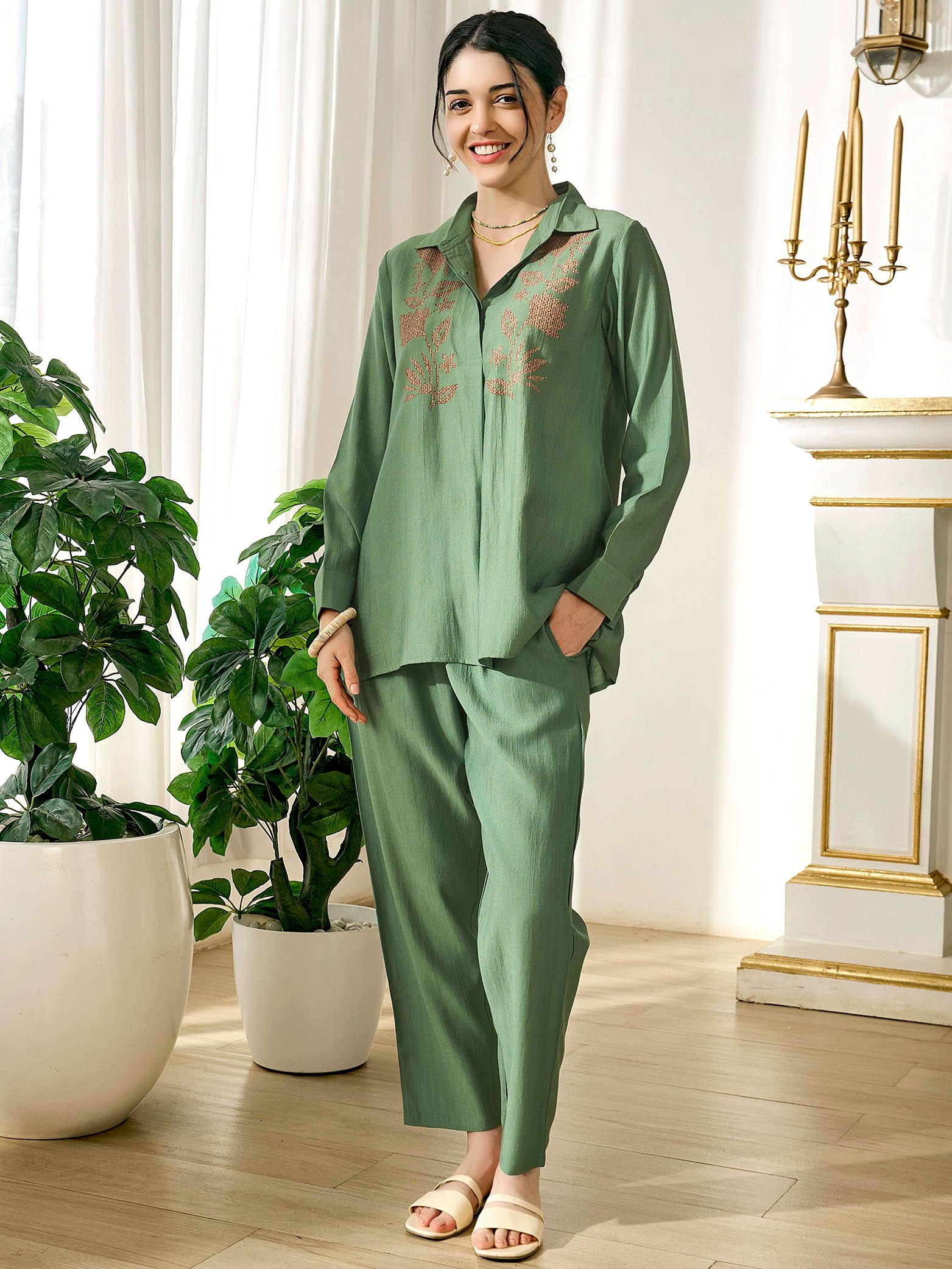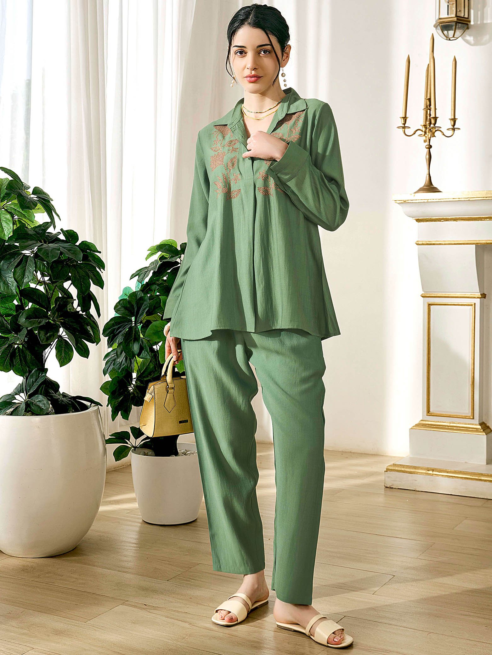 • Green Floral Printed Viscos consists of shirt and pyjamas