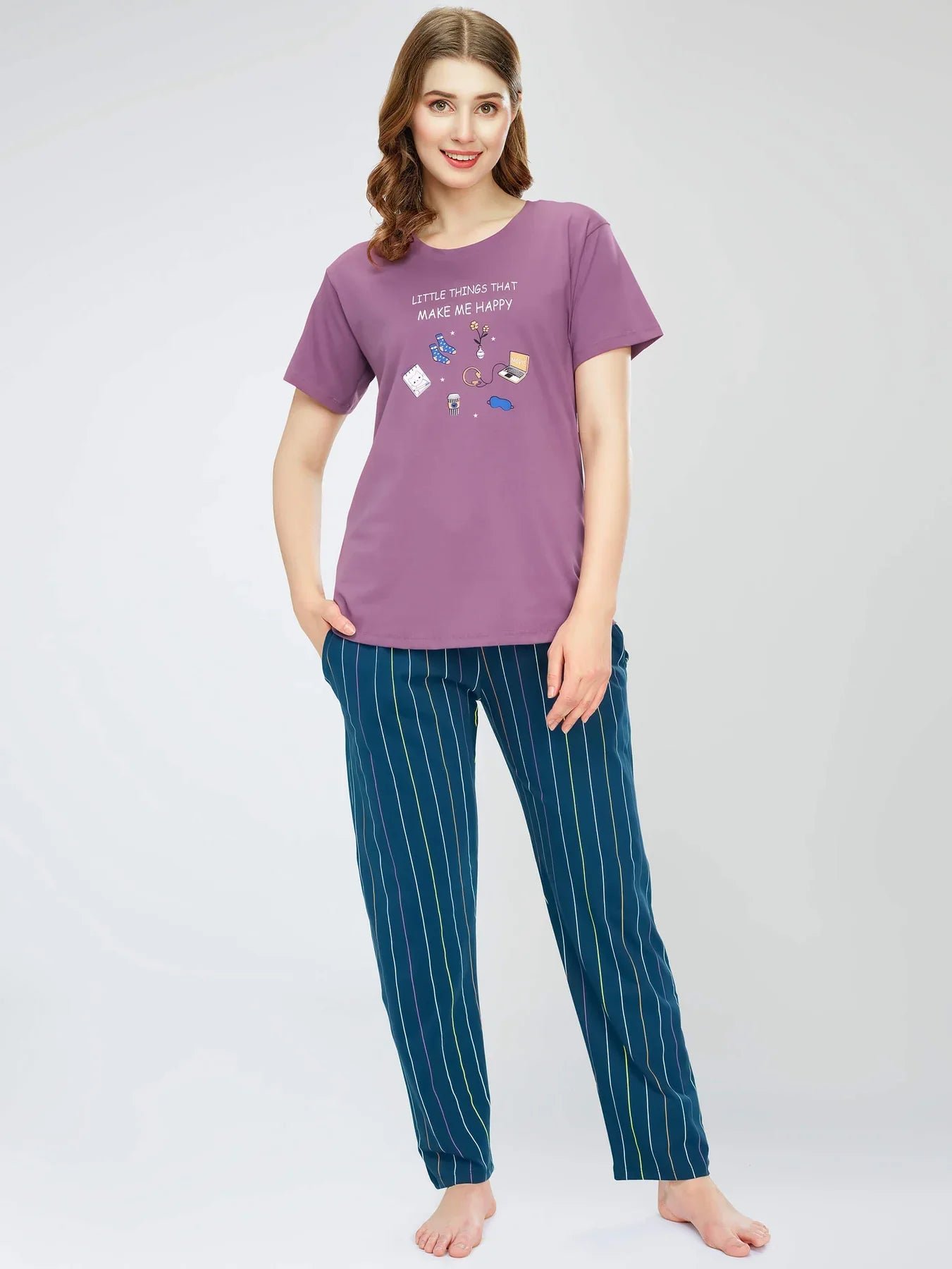 - Mauve Stripe Printed Cotton Night Dress of top and pyjamas