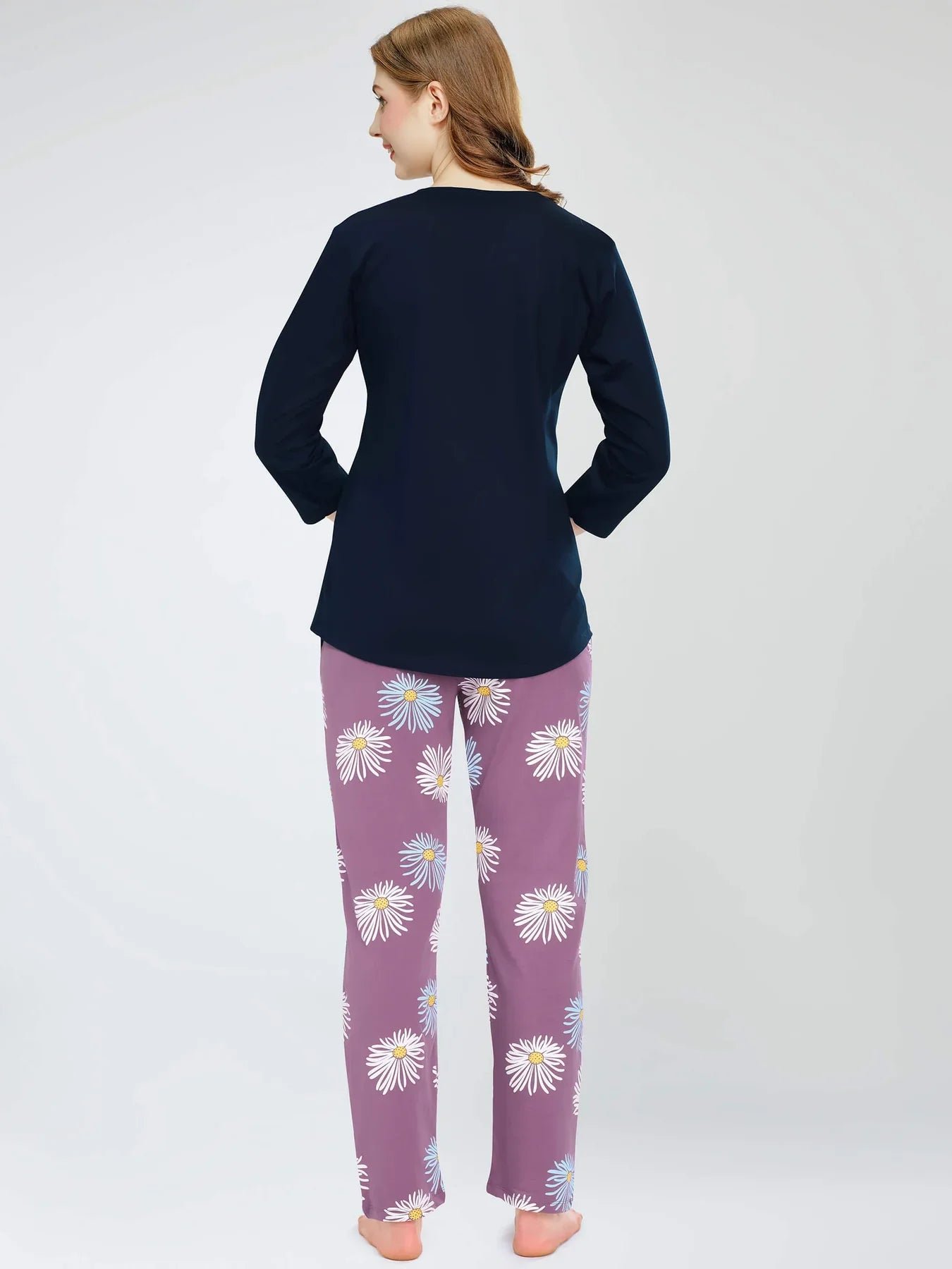 Women’s Navy Blue Floral Printed Cotton Night Dress of Top and Pajama set
