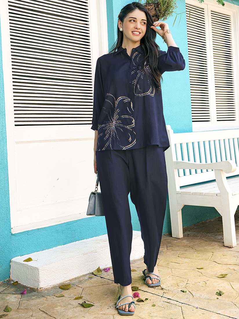 - Navy Blue Floral Printed Viscos consists of shirt and pyjamas