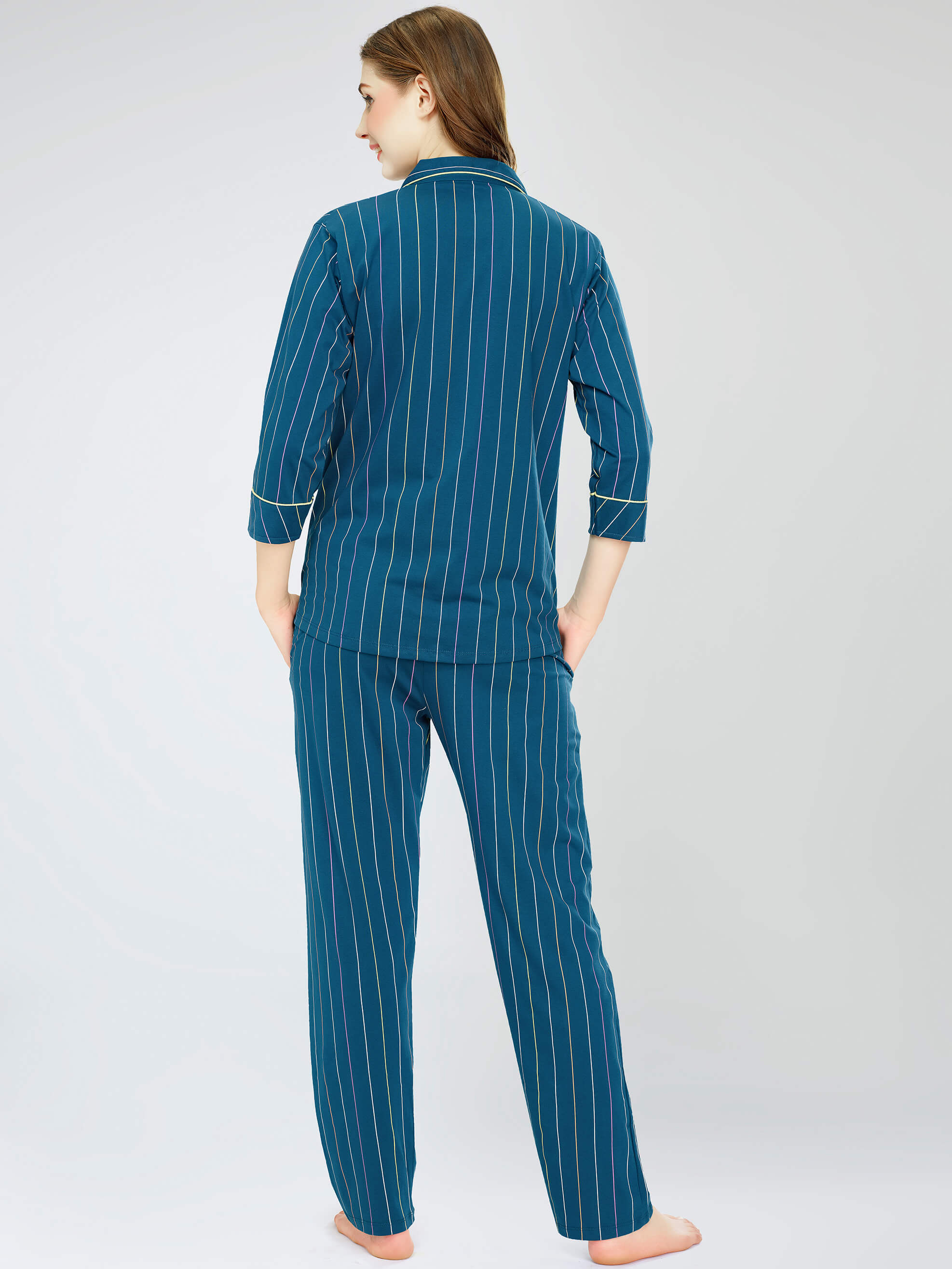- Teal Blue Stripe printed night suit consists of shirt and pyjamas